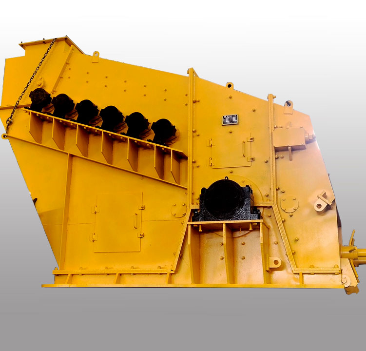 筛分破碎机采用三台交流电动机分别带动粗、细破齿辊相向转动。物料由入料口进入破碎机后,首先受到高速旋转的粗破齿辊与反击板的劈破、折破、击破等多种组合破碎,粗破后,直接落入筛分腔进行筛分,符合粒度要求的,则进入细碎腔进行破碎,使其达到所需粒度要求。